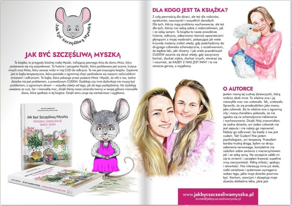 Już pierwszy tom książeczki „Jak być szczęśliwą Myszką – Myszka odnajduje swój dom” był dla mnie niezwykłym przeżyciem, odkryciem baśniowego świata, który we mnie drzemie. Sumą zdarzeń, które były bardzo trudne, ale zamieniły się w kojącą opowieść dla mojej córki i dla innych dzieci. To nie jest jednak zwykła bajka, opowieść terapeutyczna, a przekaz dla dzieci, dorosłych i nauczycieli o tym, jak ważna jest miłość, akceptacja i tolerancja dla odmienności.