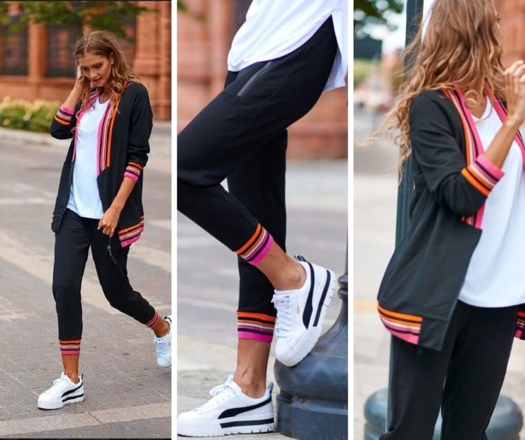 Uwielbiam elegancję na luzie i takie oto sportowo eleganckie zestawy. Bielutkie trampki będą pasować idealnie do tego zestawu (jeśli lubisz chodzić w butach po domu) lub będą czekać jeśli po home office zdecydujesz się na wyjście. I nie musi to być koniecznie zawodowe wyjście, bo taki komplet sprawdzi się podczas wielu okazji. Ja osobiście kocham taki styl po prostu na co dzień. Znajdziesz go w sklepie Cloth Store.pl