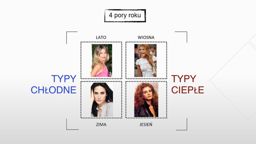 A teraz spójrz na poniższą grafikę i spróbuj dopasować swój typ urody. Kim jesteś? Zgaszonym, delikatnym, słowiańskim latem? Czy może mocną, ciemną, ciepłą jesienią? Spójrz w lusterko i spróbuj to ustalić.