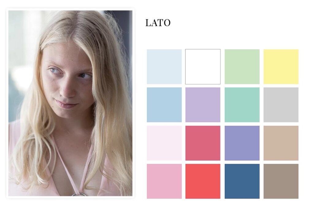 Lato, typ urody słowiańskiej, jasnej i delikatnej dlatego kolory Lata powinny być przede wszystkim jasne, pastelowe i mało wyraziste. Drugim atrybutem tego typu kolorystycznego jest chłodny odcień, co oznacza, że osoby o tym typie urody częściej będą sięgały po chłodne pastele. Ten typ kolorystyczny pięknie prezentuje się w jasnych, chłodnych, przypudrowanych pastelach – pudrowy róż, gołębi błękit, miętowy, piaskowy beż, jasne szarości, czerwień arbuzowa. I pamiętaj bardzo ważne – wiosna oraz lato, to jasne typy kolorystyczne. Od tego zacznij swoją diagnozę!