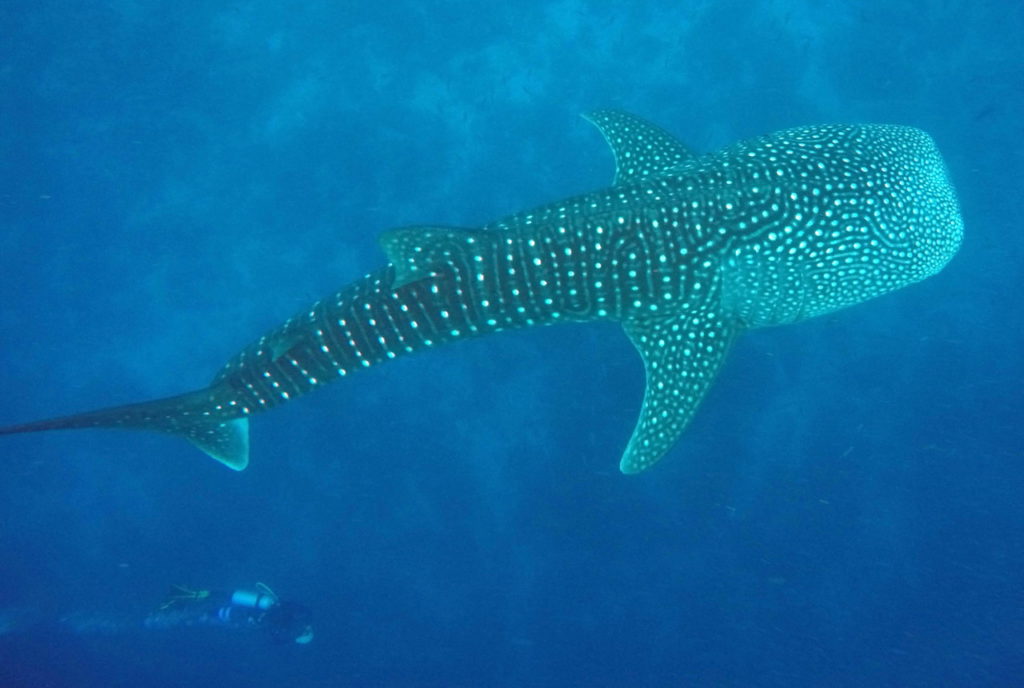 Wróciliśmy na łódź i ponownie zeszliśmy pod wodę. Często wychodziłam pierwsza, bo najszybciej kończyło mi się powietrze. Byłam razem z moim buddy i dive masterem. Weszliśmy na naszą łódź Tirę, gdy nagle kapitan zaczął krzyczeć, abyśmy szybko zakładali maski i płetwy i wskakiwali do wody. Rekin wielorybi płynął prosto na nas.