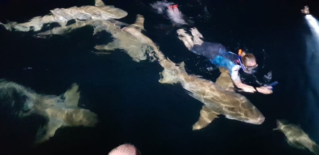 Idąc za ciosem zapisałam się na kolejne nocne nurkowanie z rekinami, ale gdy dopłynęliśmy na miejsce, to zrezygnowałam. Małe doświadczenie w nurkowaniu nocnym, długa przerwa w nurkowaniu uruchomiły głos rozsądku. Wróciliśmy na łódź i tylko my we dwie z Kasią nie widziałyśmy rekinów. Nasza niesamowita ekipa ze statku postanowiła to zmienić. Powiedzieli: wy też musicie je zobaczyć i zwabili rekina blisko naszej łodzi, abyśmy mogły zaznać tego niesamowitego uczucia jakim jest pływanie z rekinami!!!!