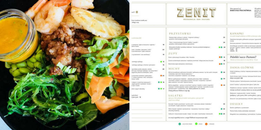 Zatrzymaliśmy się przy dużej karcie z menu na zewnątrz restauracji, która wydawała się znajoma. Zapamiętałam zdjęcia z bloga i postanowiliśmy sprawdzić czy to faktycznie to miejsce. Restauracja Zenit zachęcała przestronnym wnętrzem i dużą ilością światła dziennego. Wyglądała bardzo nowocześnie ale też przystępnie. W karcie rzuciła nam się w oczy micha z krewetkami i ryżem w sosie terijaki więc wybór miał być prosty. Jednak karta okazała się być mieszana a nie azjatycka jak myśleliśmy. Oprócz michy krewetkowej dostępny też był tatar i schabowy. Dania kompletnie nie dla nas. Postanowiliśmy więc, że weźmiemy jedną michę na połowę i pójdziemy na pizzę do sprawdzonej już włoskiej restauracji.